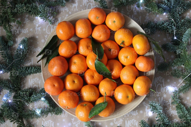 Мандарины на тарелке, украшенной рождественской гирляндой и еловыми ветками. Рождественский и новогодний фон