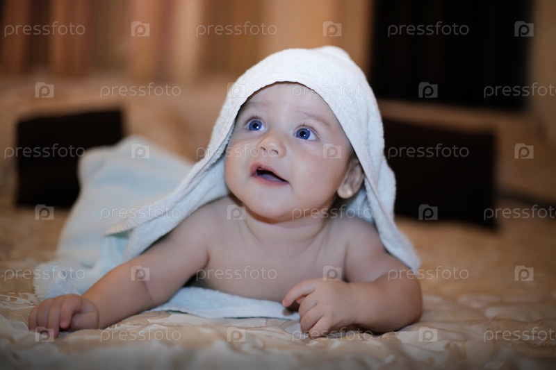 Счастливый ребенок, завернутый в полотенце после купания, лежит на кровати в комнате крупным планом
