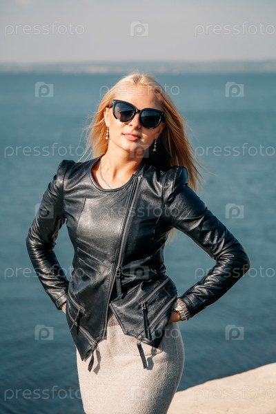 Шикарная женщина в стильных солнцезащитных очках и модной кожаной куртке грациозно позирует у спокойных вод