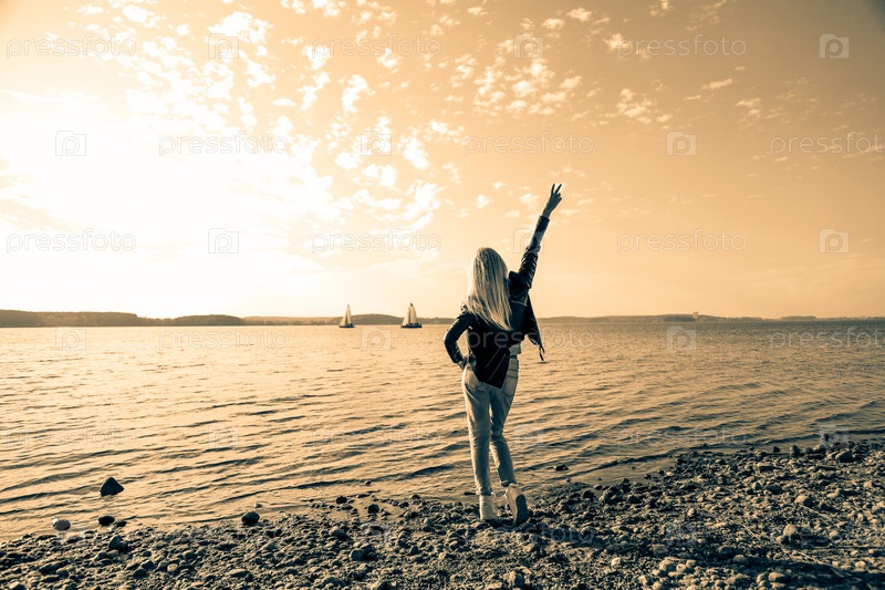 Женщина стоит на пляже и смотрит на море на закате