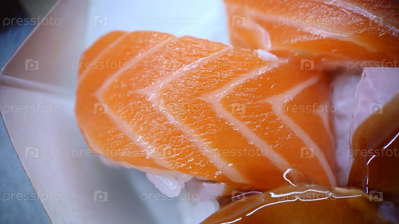 Традиционная японская еда суши роллы из красной рыбы в коробке. Вид сверху. Текстура или фон. Макрофотография