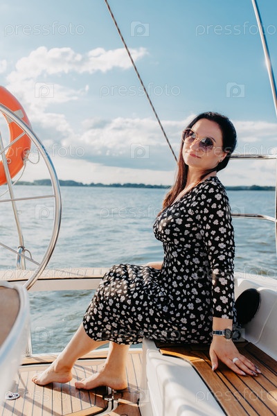 Женщина в очках сидит на палубе лодки на фоне моря