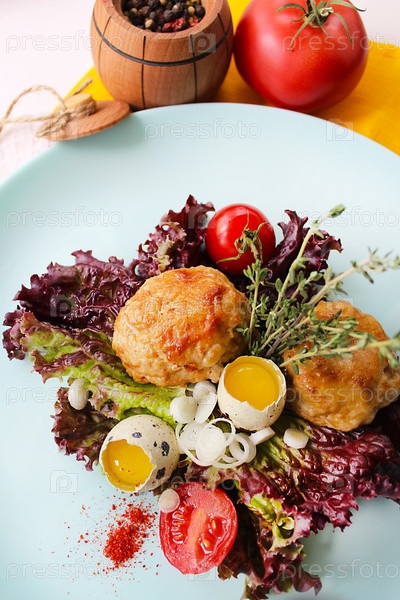 На белой тарелке перепелиные яйца с жареными котлетами и зеленью. Вид сверху