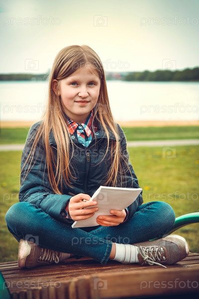 Молодая девушка сидит, скрестив ноги, на скамейке возле озера, держа в руках листок бумаги