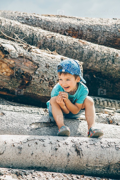 Мальчик сидит на бревне и весело смеется