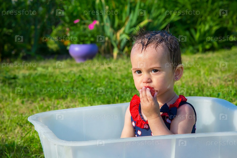 Маленький ребенок сидит в ванне и ест вкусную клубнику на открытом воздухе в летний день
