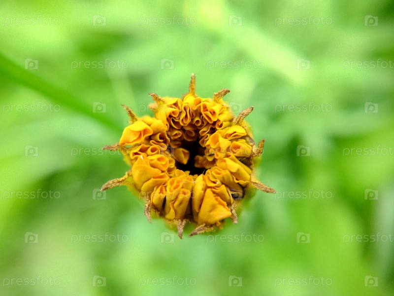 Нераскрывшийся оранжевый цветок календулы на травянистом фоне.Макрофотография.Текстура или фон.Выборочный фокус