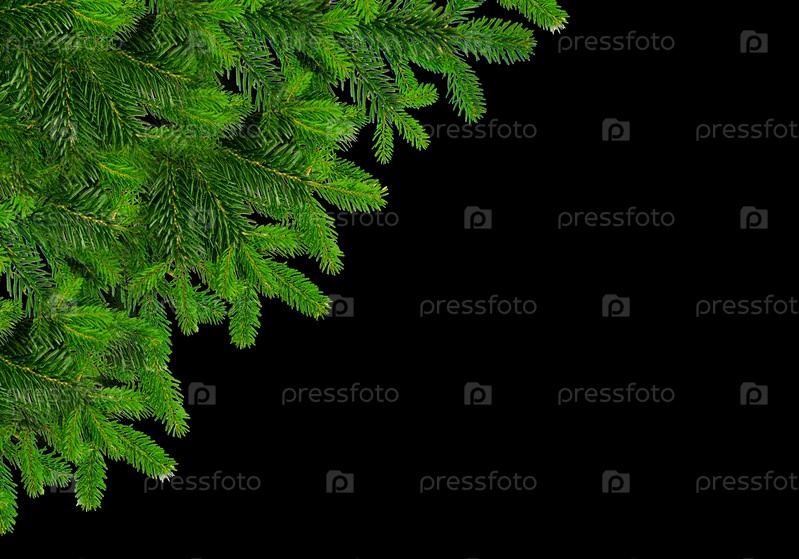 Зеленые еловые ветки в левом верхнем углу на черном фоне