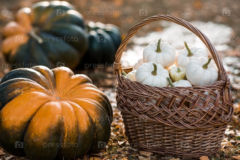Осенний тыквенный фон. Белые тыквы в плетеной корзине. Богатый урожай. Концепция праздника Хэллоуин или День благодарения