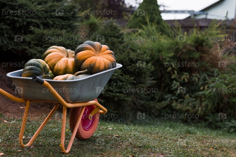 Осенний тыквенный фон. Богатый урожай дынных тыкв в садовой тачке. Концепция праздника Хэллоуин или День благодарения