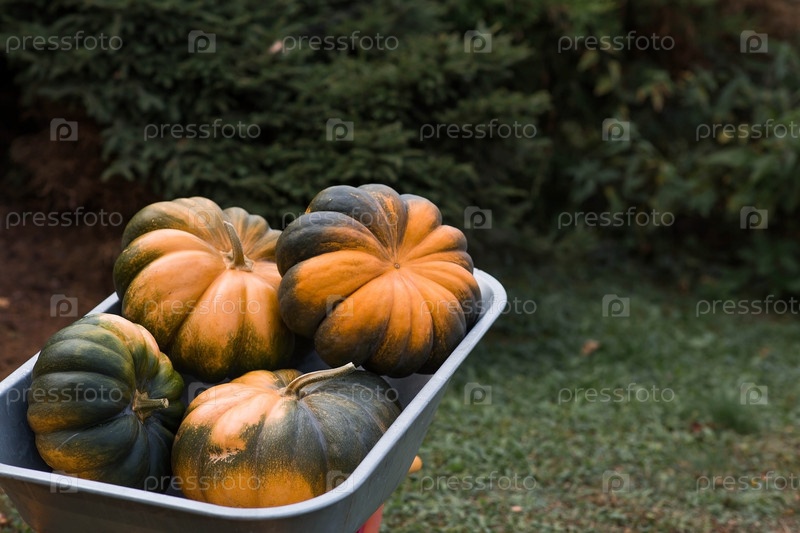 Осенний тыквенный фон. Богатый урожай дынных тыкв в садовой тачке. Концепция праздника Хэллоуин или День благодарения