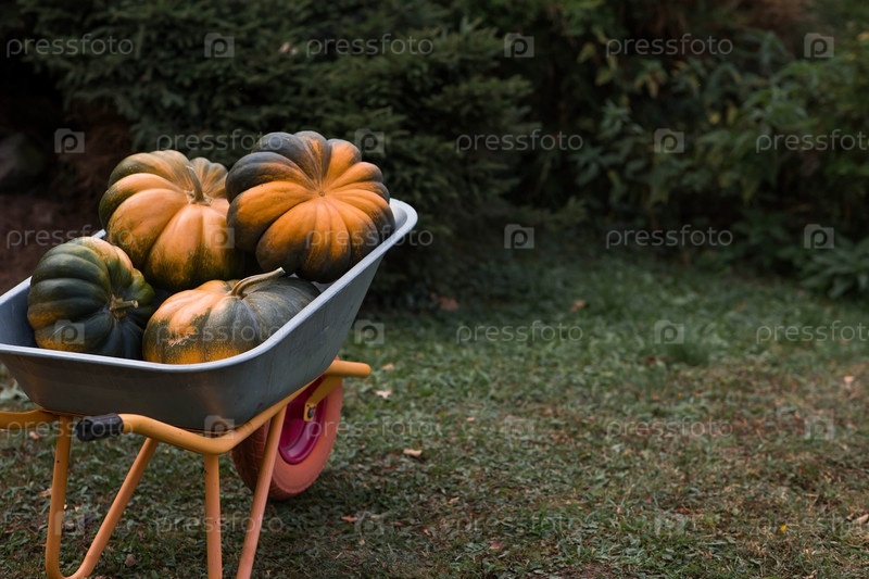 Осенний тыквенный фон. Богатый урожай дынных тыкв в садовой тачке. Концепция праздника Хэллоуин или День благодарения