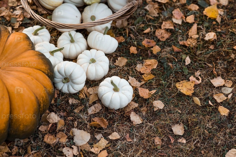 Осенний фон из белых декоративных тыкв в плетеной корзине. Богатый урожай. Концепция праздника Хэллоуин или День благодарения