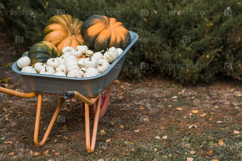 Осенний тыквенный фон. Богатый урожай дынных тыкв в садовой тачке. Концепция праздника Хэллоуин или День благодарения