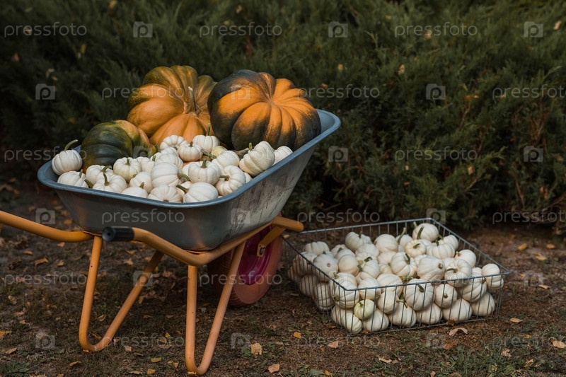 Осенний тыквенный фон. Богатый урожай дынных тыкв в садовой тачке. Концепция праздника Хэллоуин или День благодарения