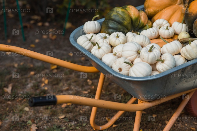 Осенний тыквенный фон. Богатый урожай дынных тыкв в садовой тачке. Концепция праздника Хэллоуин или День благодарения