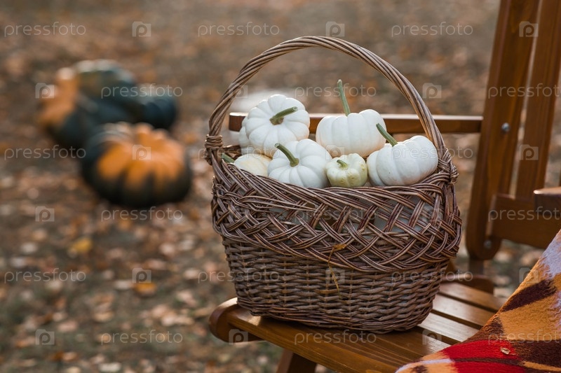 Осенний тыквенный фон. Белые тыквы в плетеной корзине. Богатый урожай. Концепция праздника Хэллоуин или День благодарения