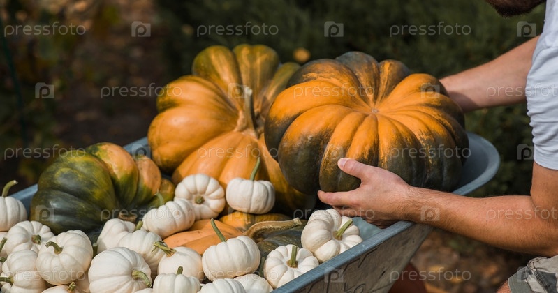 Осенний тыквенный фон. Богатый урожай дынных тыкв в садовой тачке. Тыква в руках фермера. Концепция праздника Хэллоуин