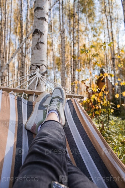 Отдых на природе. Женские ноги, обутые в кроссовки, в гамаке в осеннем лесу. Концепция уютного осеннего отпуска