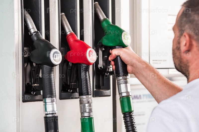 Заправка. Заправка автомобиля бензином. Мужчина держит российский топливораздаточный пистолет на заправке. Рост цен на топливо по всему миру