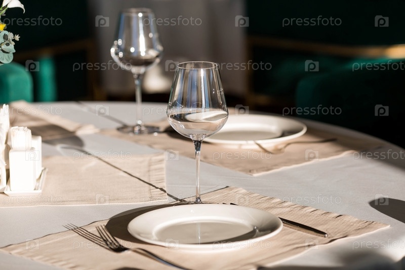 Стильная сервировка стола. Стеклянные бокалы, тарелки, столовые приборы на столе. Свадебный сервиз, прием за обеденным столом. День рождения, крещение, праздничное мероприятие