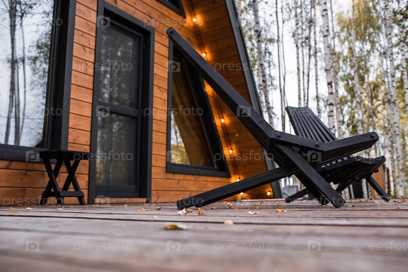 Два стильных деревянных шезлонга на веранде А-образного каркасного дома в скандинавском стиле. Тихий отдых. Концепция глэмпинга и аренды шале