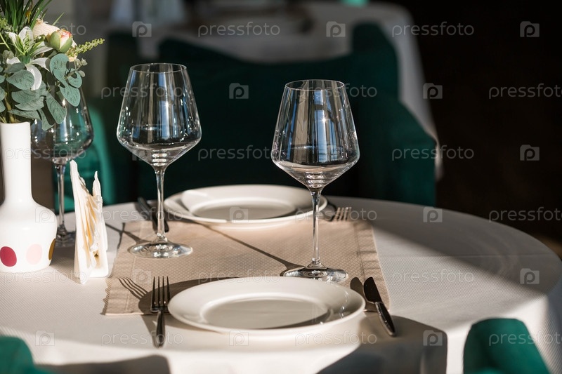 Стильная сервировка стола. Стеклянные бокалы, тарелки, столовые приборы на столе. Свадебный сервиз, прием за обеденным столом. День рождения, крещение, праздничное мероприятие