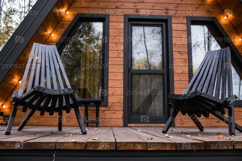 Два стильных деревянных шезлонга на веранде А-образного каркасного дома в скандинавском стиле. Тихий отдых. Концепция глэмпинга и аренды шале