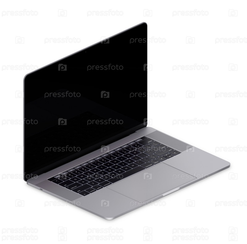 Вид под углом. Ноутбук изолирован на белом фоне с пустым черным экраном. Текст или фон. Пустое место для рисования текста. 3D-изоляция