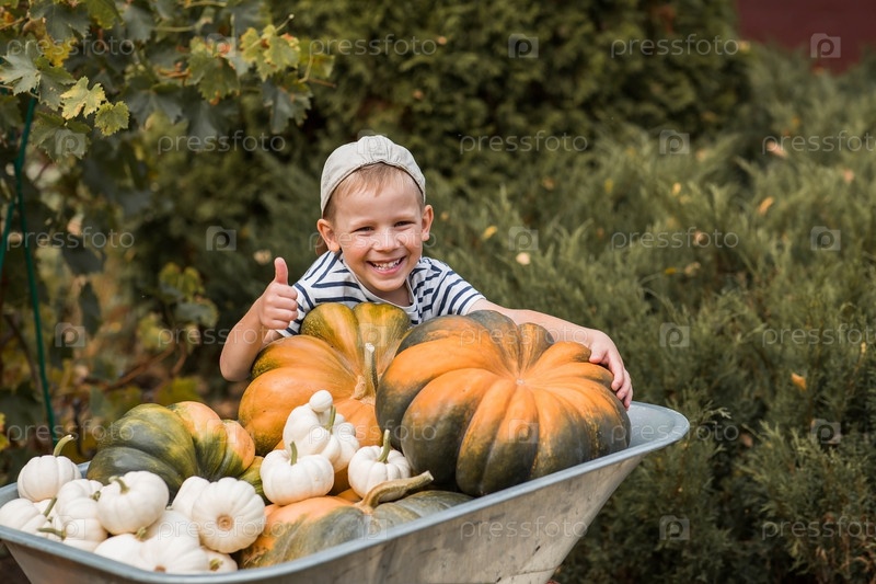 Осенний урожай богатого урожая тыкв и красивый 5-летний мальчик в садовой тачке. Концепция праздника Хэллоуин или День благодарения