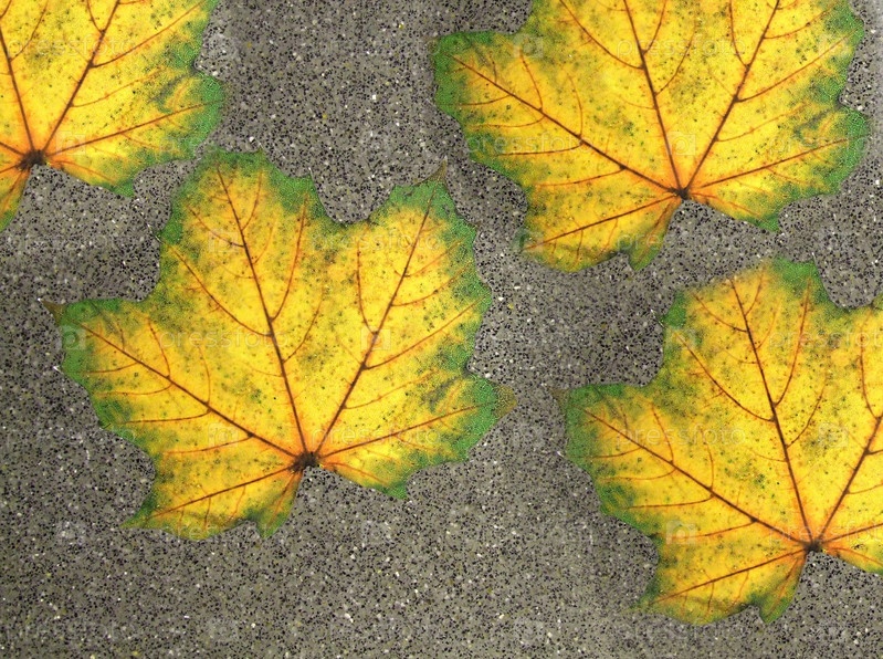 Четыре желтых кленовых листа лежат на серой асфальтированной дороге, вид сверху крупным планом