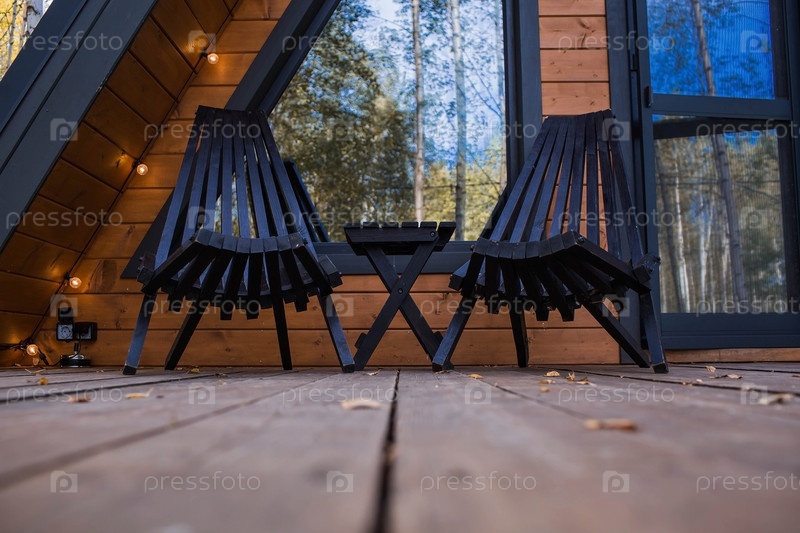 Два стильных деревянных шезлонга на веранде А-образного каркасного дома в скандинавском стиле. Тихий отдых. Концепция глэмпинга и аренды шале