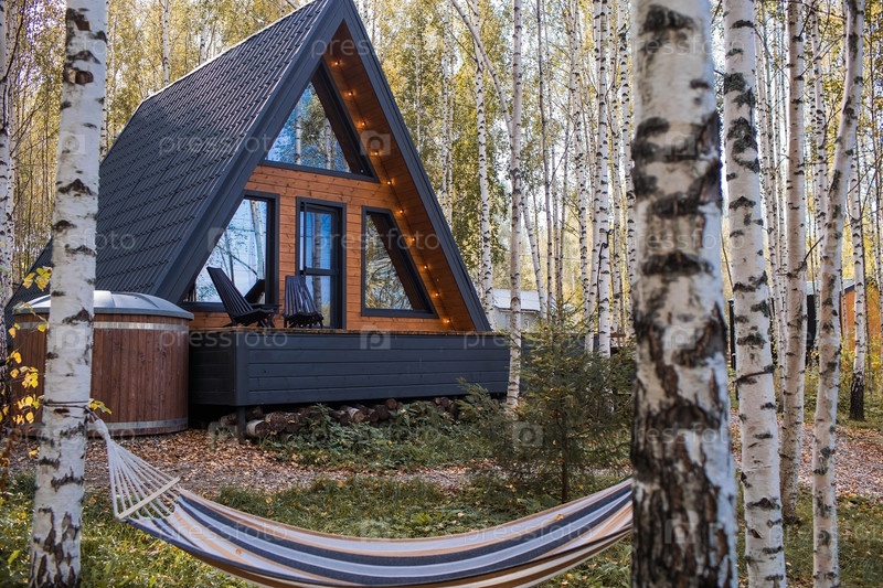 А-образный каркасный дом в скандинавском стиле и гамак. Ландшафт. Тихий отдых. Концепция глэмпинга и аренды шале. Деревянный дом с верандой в осеннем березовом лесу