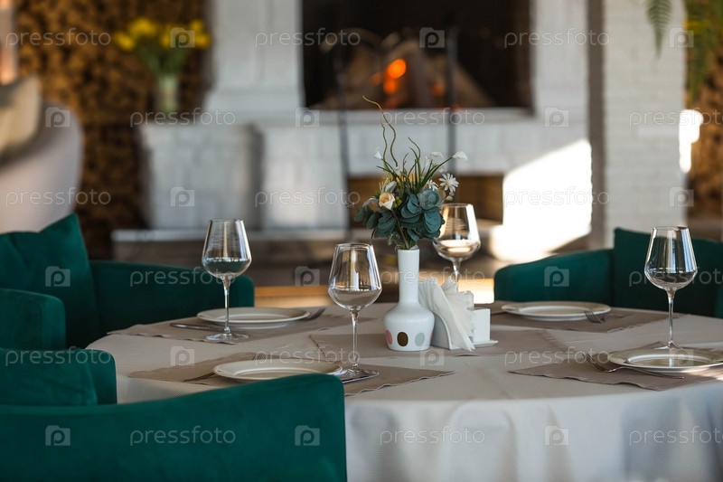 Стильная сервировка стола. Стеклянные бокалы, тарелки, столовые приборы на столе. Свадебный сервиз, прием за обеденным столом. День рождения, крещение, праздничное мероприятие