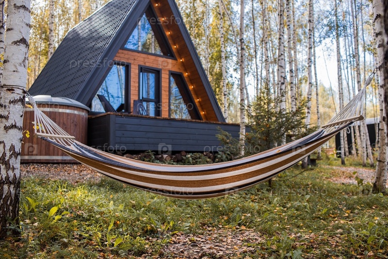 А-образный каркасный дом в скандинавском стиле и гамак. Ландшафт. Тихий отдых. Концепция глэмпинга и аренды шале. Деревянный дом с верандой в осеннем березовом лесу