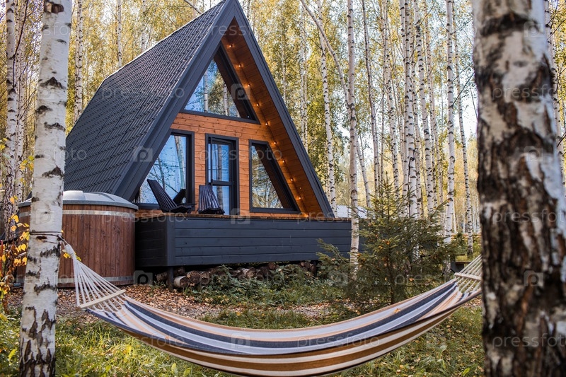 А-образный каркасный дом в скандинавском стиле и гамак. Ландшафт. Тихий отдых. Концепция глэмпинга и аренды шале. Деревянный дом с верандой в осеннем березовом лесу