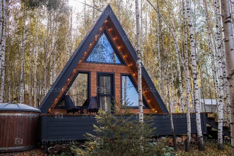 А-образный каркасный дом в скандинавском стиле. Ландшафт. Тихий отдых. Концепция глэмпинга и аренды шале. Деревянный дом с верандой на природе вокруг осеннего березового леса