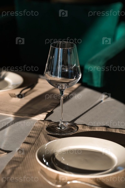 Стильная сервировка стола. Стеклянные бокалы, тарелки, столовые приборы на столе. Свадебный сервиз, прием за обеденным столом. День рождения, крещение, праздничное мероприятие