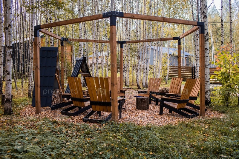 Экологичная, стильная зона барбекю и деревянные стулья для отдыха у костра. Топор будет воткнут в деревянное полено. Колка дров