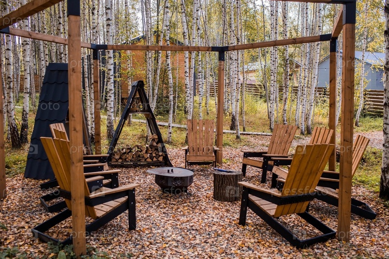 Экологичная, стильная зона барбекю и деревянные стулья для отдыха у костра. Топор будет воткнут в деревянное полено. Колка дров