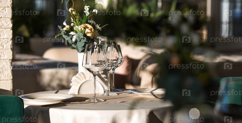 Стильная сервировка стола. Стеклянные бокалы, тарелки, столовые приборы на столе. Свадебный сервиз, прием за обеденным столом. День рождения, крещение, праздничное мероприятие