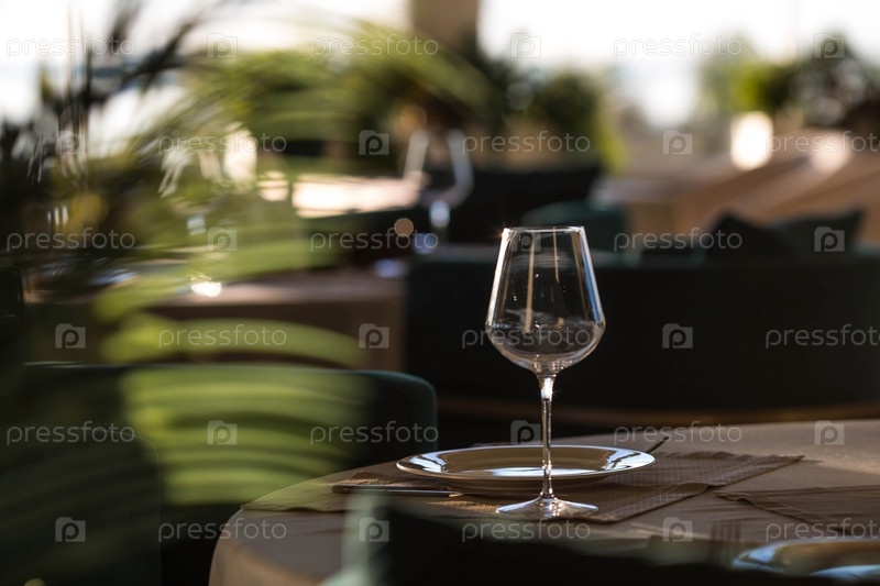 Стильная сервировка стола. Стеклянные бокалы, тарелки, столовые приборы на столе. Свадебный сервиз, прием за обеденным столом. День рождения, крещение, праздничное мероприятие
