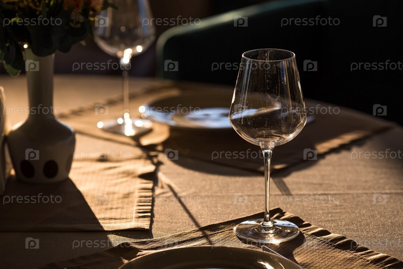 Стильная сервировка стола. Стеклянные бокалы, тарелки, столовые приборы на столе. Свадебный сервиз, прием за обеденным столом. День рождения, крещение, праздничное мероприятие
