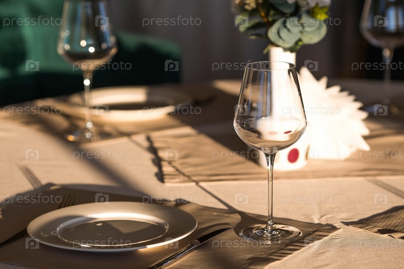 Стильная сервировка стола. Стеклянные бокалы, тарелки, столовые приборы на столе. Свадебный сервиз, прием за обеденным столом. День рождения, крещение, праздничное мероприятие