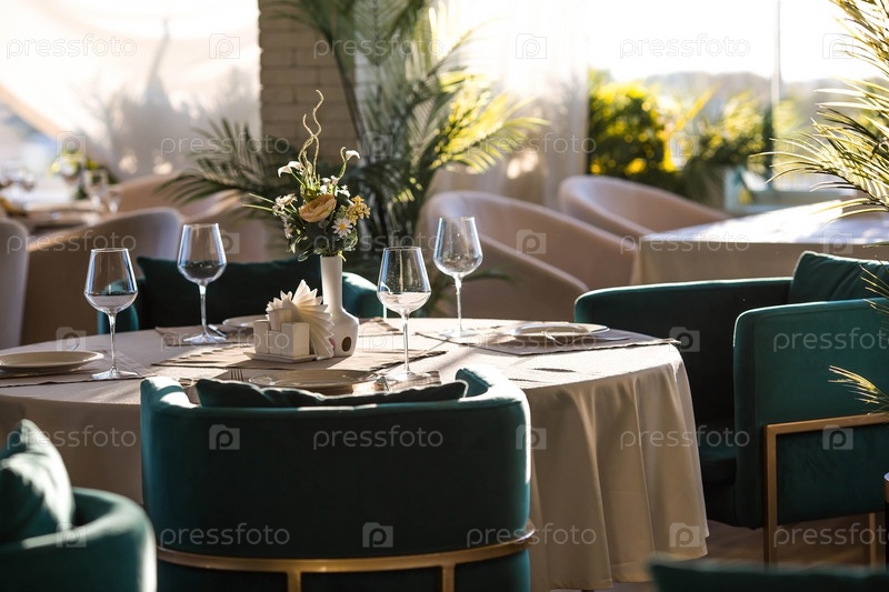 Стильная сервировка стола. Стеклянные бокалы, тарелки, столовые приборы на столе. Свадебный сервиз, прием за обеденным столом. День рождения, крещение, праздничное мероприятие