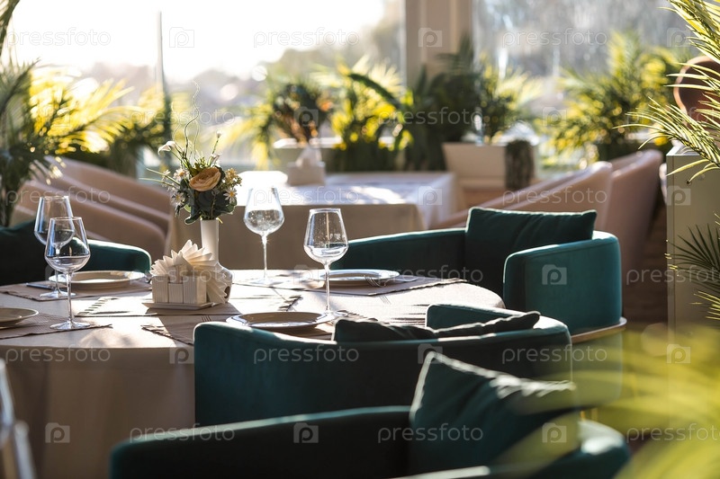 Стильная сервировка стола. Стеклянные бокалы, тарелки, столовые приборы на столе. Свадебный сервиз, прием за обеденным столом. День рождения, крещение, праздничное мероприятие