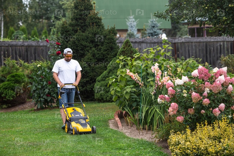 Баннер. Газонокосильщик косит траву на заднем дворе. Сельскохозяйственная техника для ухода за садом