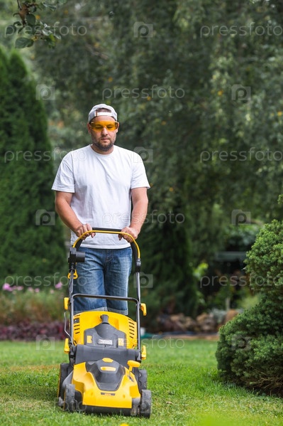 Баннер. Газонокосильщик косит траву на заднем дворе. Сельскохозяйственная техника для ухода за садом
