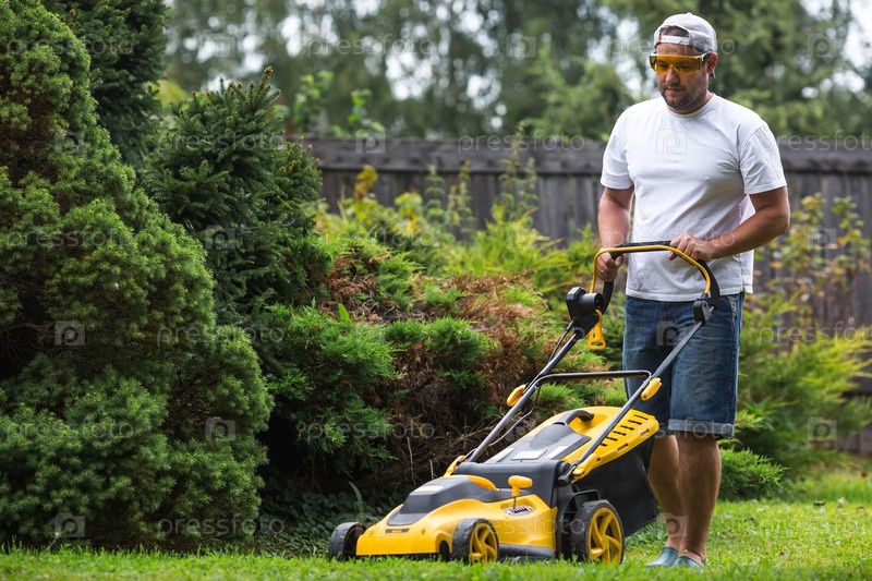 Баннер. Газонокосильщик косит траву на заднем дворе. Сельскохозяйственная техника для ухода за садом