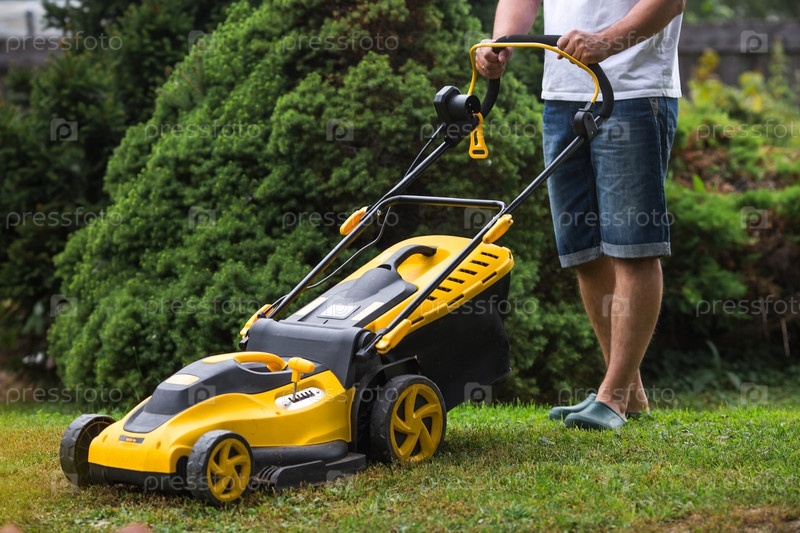 Баннер. Газонокосильщик косит траву на заднем дворе. Сельскохозяйственная техника для ухода за садом